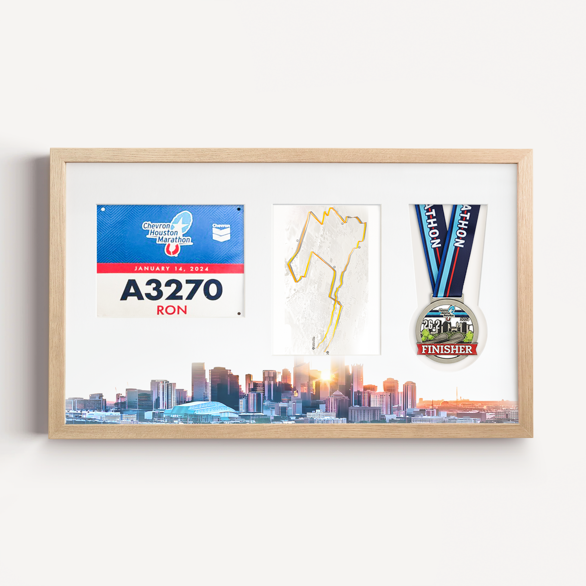 Featuring the bold Houston city skyline print, this frame is designed to showcase medals and bibs from any race or endurance event held in this region, across any year. Because your medal and bib already carry official event branding, the frame remains timeless - whether you raced recently or years ago.