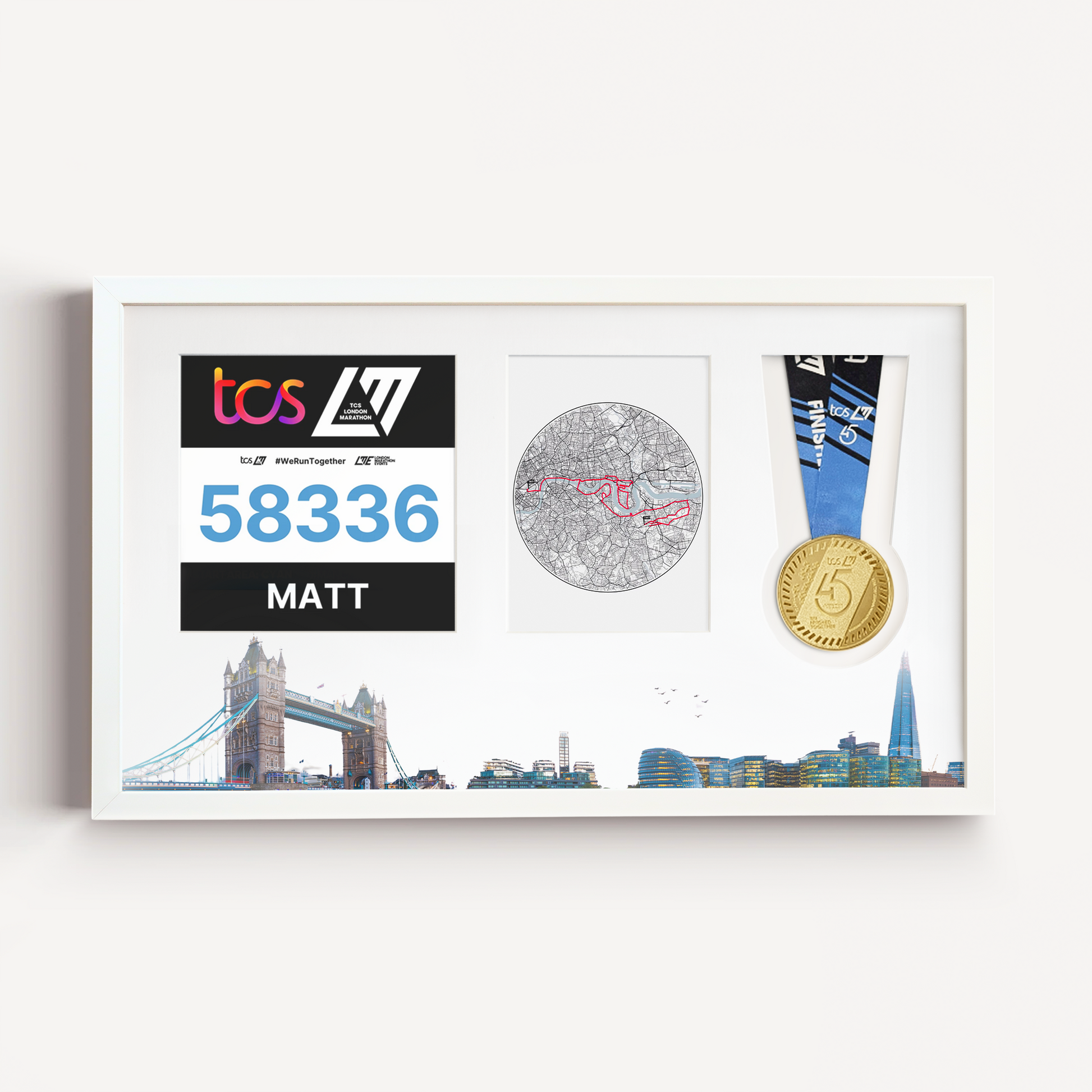 The perfect medal display frame for athletes who have competed in the TCS London Marathon as well as other major London-based events, such as London Triathlon, RideLondon and London Landmarks Half Marathon