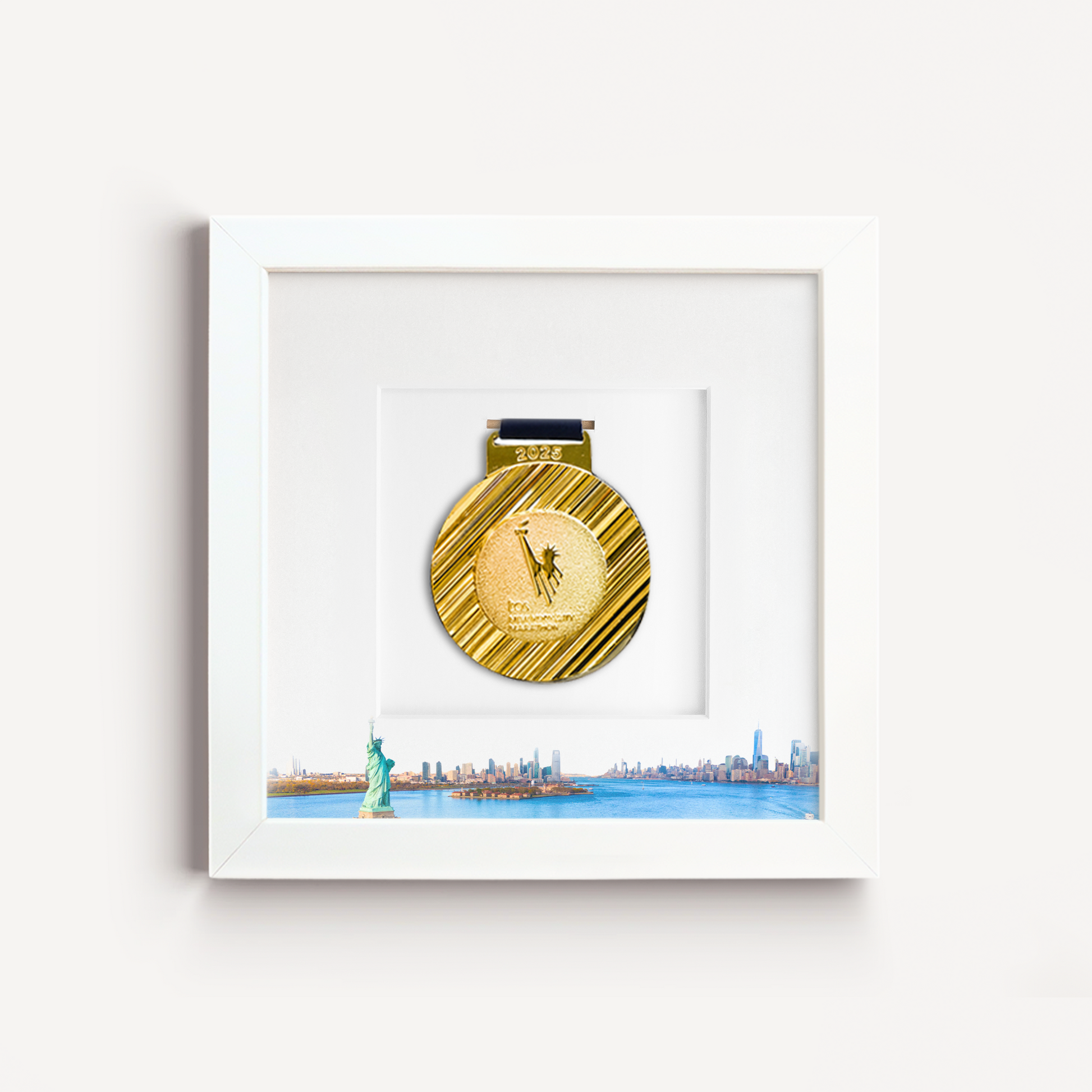 Featuring a landmark filled NYC skyline, this frame is designed to showcase medals and bibs from any race or endurance event held in this region, across any year. Because your medal and bib already carry official event branding, the frame remains timeless - whether you raced recently or years ago.