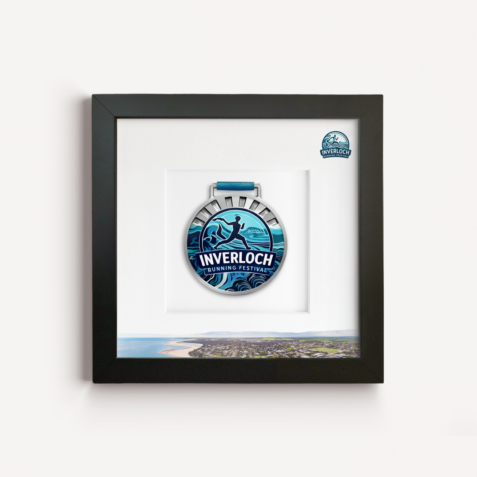 Featuring a picturesque Inverloch print, this frame is designed to showcase medals from the Inverloch Running Festival, hosted by Fit City Events.