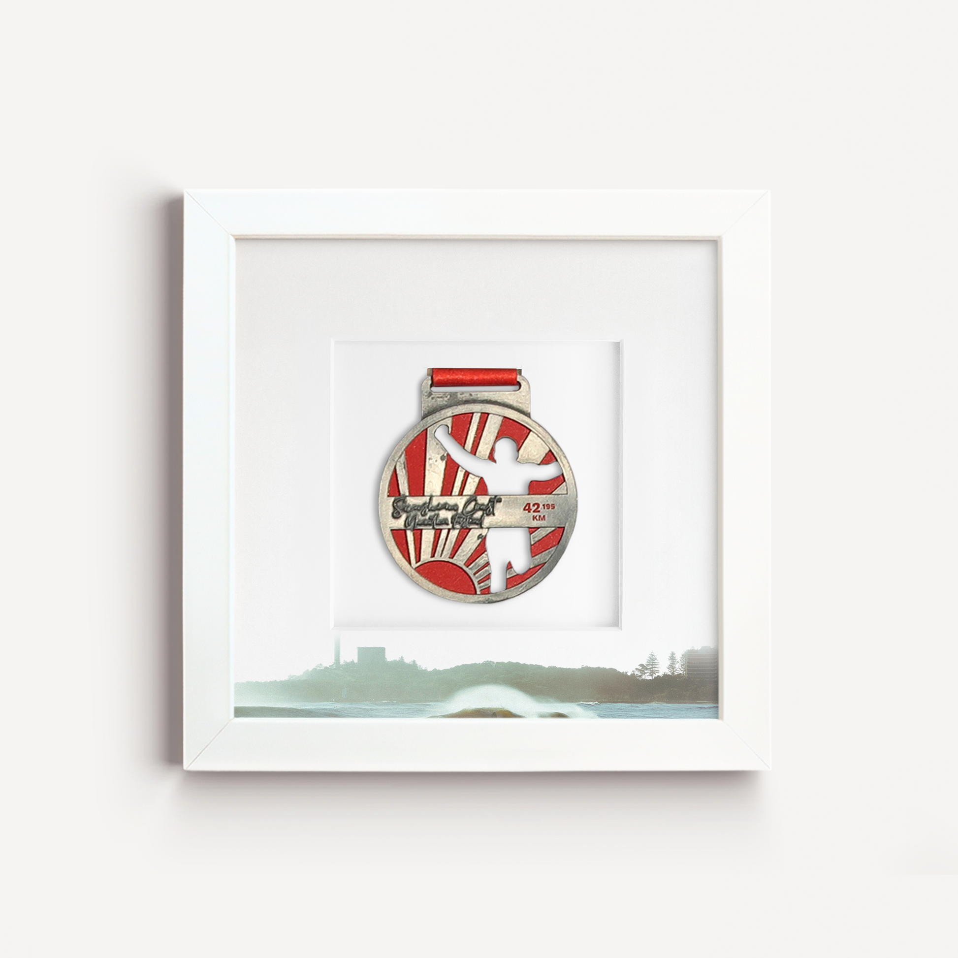The perfect medal display frame for athletes who have competed in the Sunshine Coast Marathon as well as other major Sunshine Coast-based events such as the IRONMAN 70.3 and Mooloolaba Triathlon.