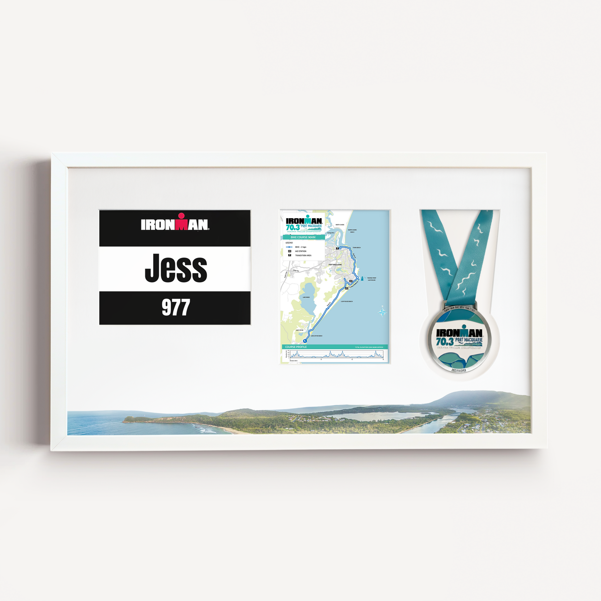 The perfect medal display frame for athletes who have competed in IRONMAN Australia as well as other major Port Macquarie-based events such as the 2026 Port Macquarie Marathon and the Port Macquarie Triathlon.